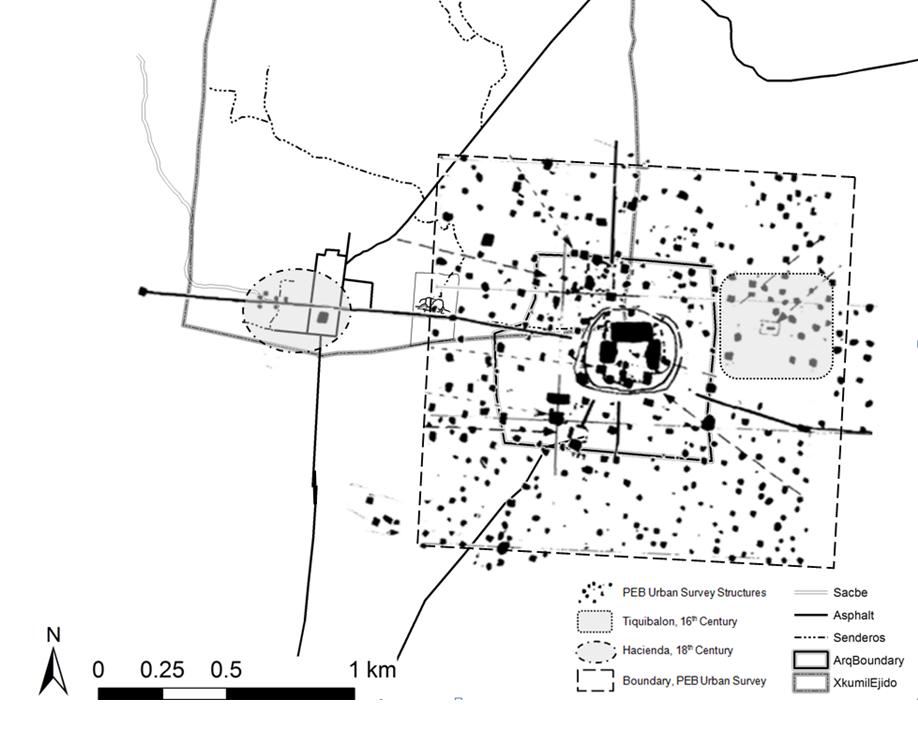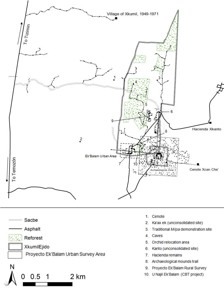 The urban area is included along with the rest of the ejido and the archaeological zone. This slide is a map of the key places that are part of this plan. In the south are the urban area of Ek’Balam and the monuments in the ceremonial center of the archaeological zone. Included here as points on the map are the CBT project, the well and hacienda foundation in the center of town, and the ball court. To the north is the rest of the ejido and Hacienda Xkantoh. In the farthest north portion is the abandoned village site of Xkumil. Key points in this region are caves, cenotes, milpas, reforestation areas, and unconsolidated monuments. All told, the map contains features that span time periods from the Terminal Classic period (circa 1000AD) to the present. Residents, however, are ambivalent about assigning periods to the map. They feel that without these designations the map creates a picture of the entirety of Ek’Balam’s heritage.